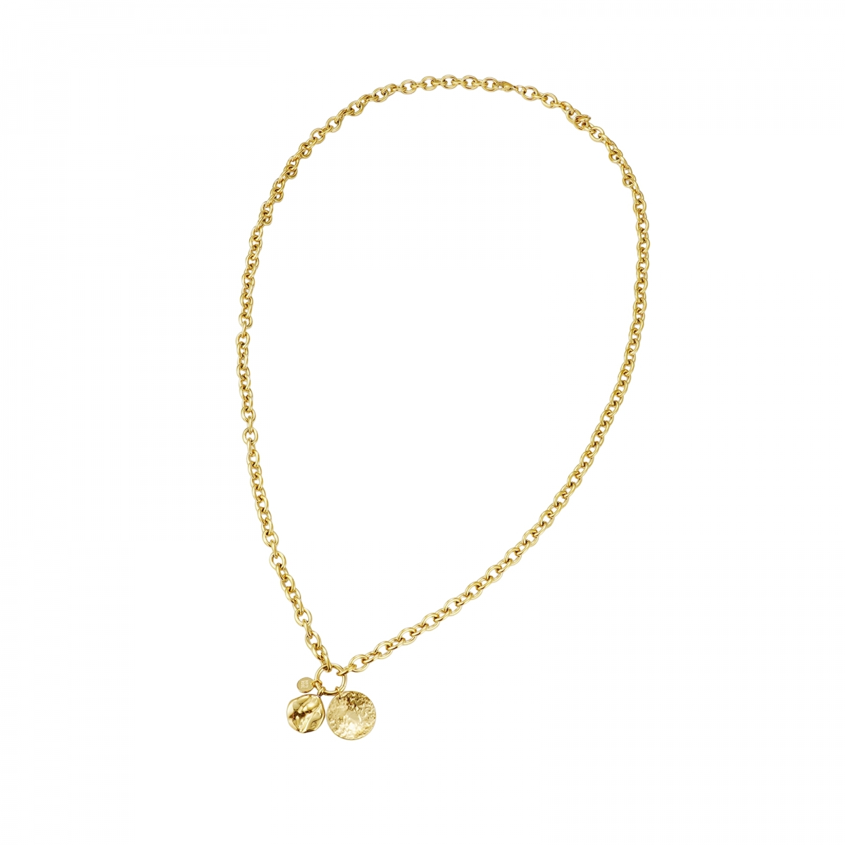 Long chain necklace featuring three charms with sculptural shapes and textured surfaces. A bold piece with edge, balancing raw detail and shine.