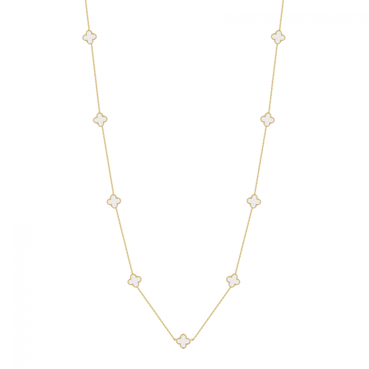 Clover Necklace blends meaning with modern style. Featuring nine clovers with white enamel this necklace brings a playful yet refined touch to your everyday look.