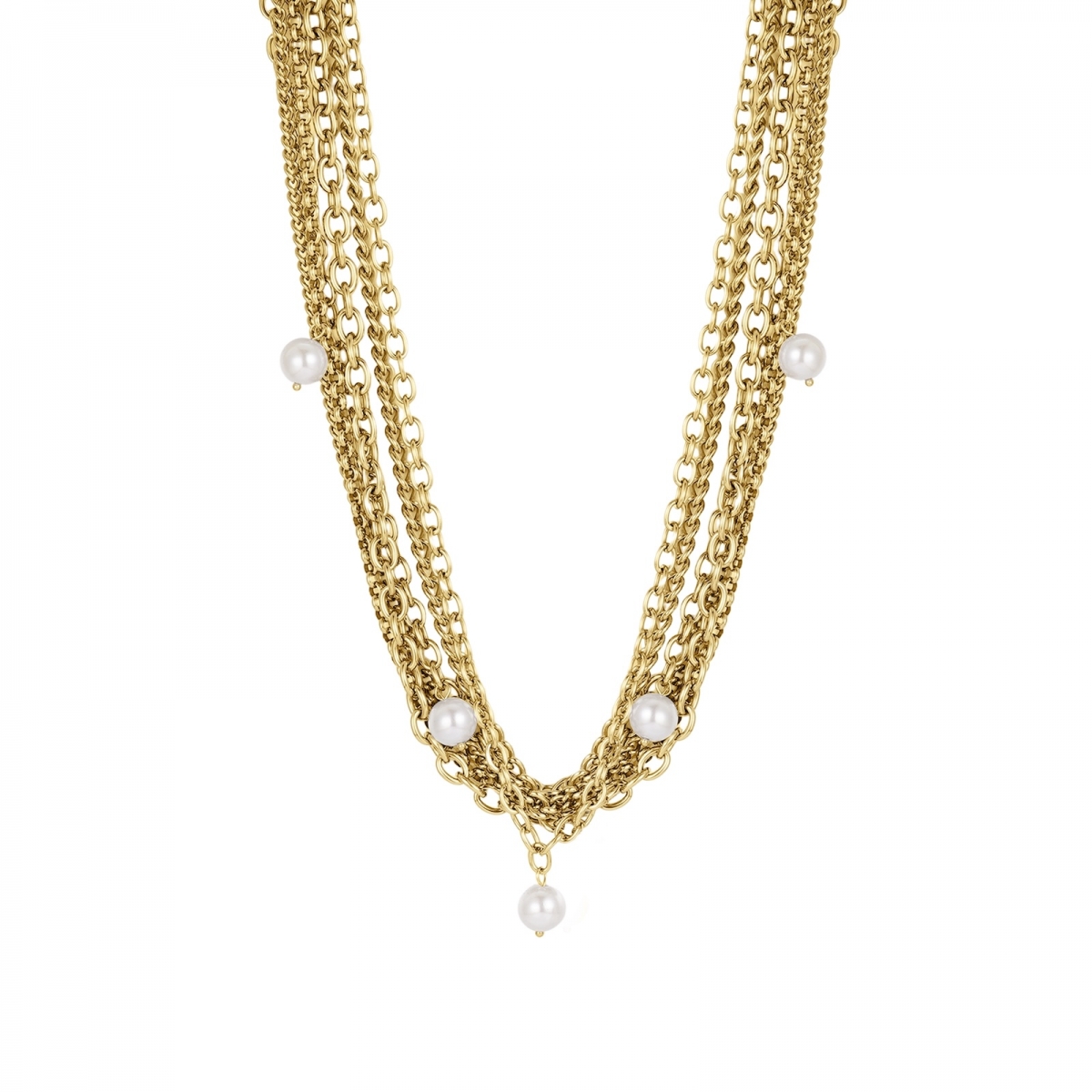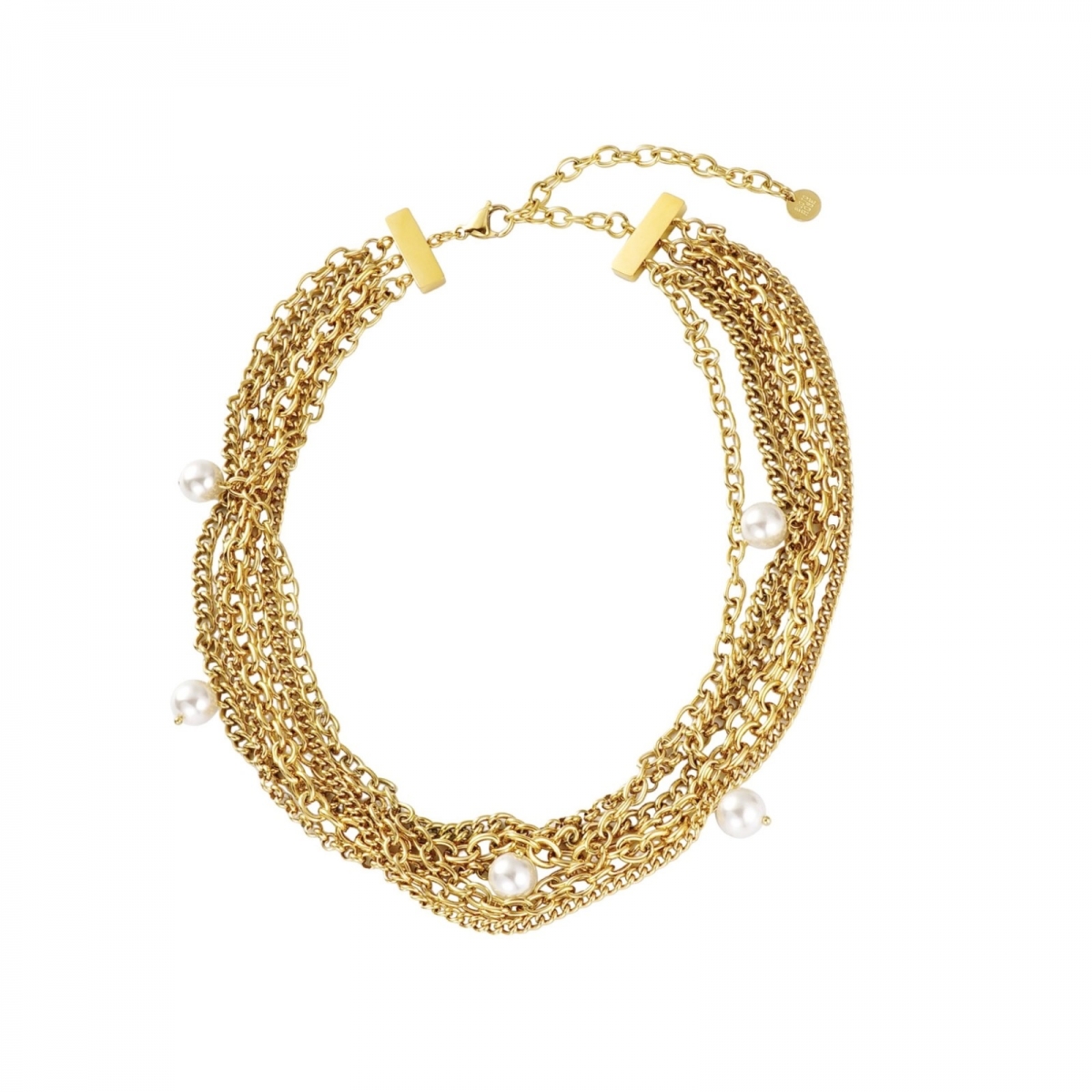 Five pearls in contrast with the sleek chains, creating a look that is both sophisticated and edgy.